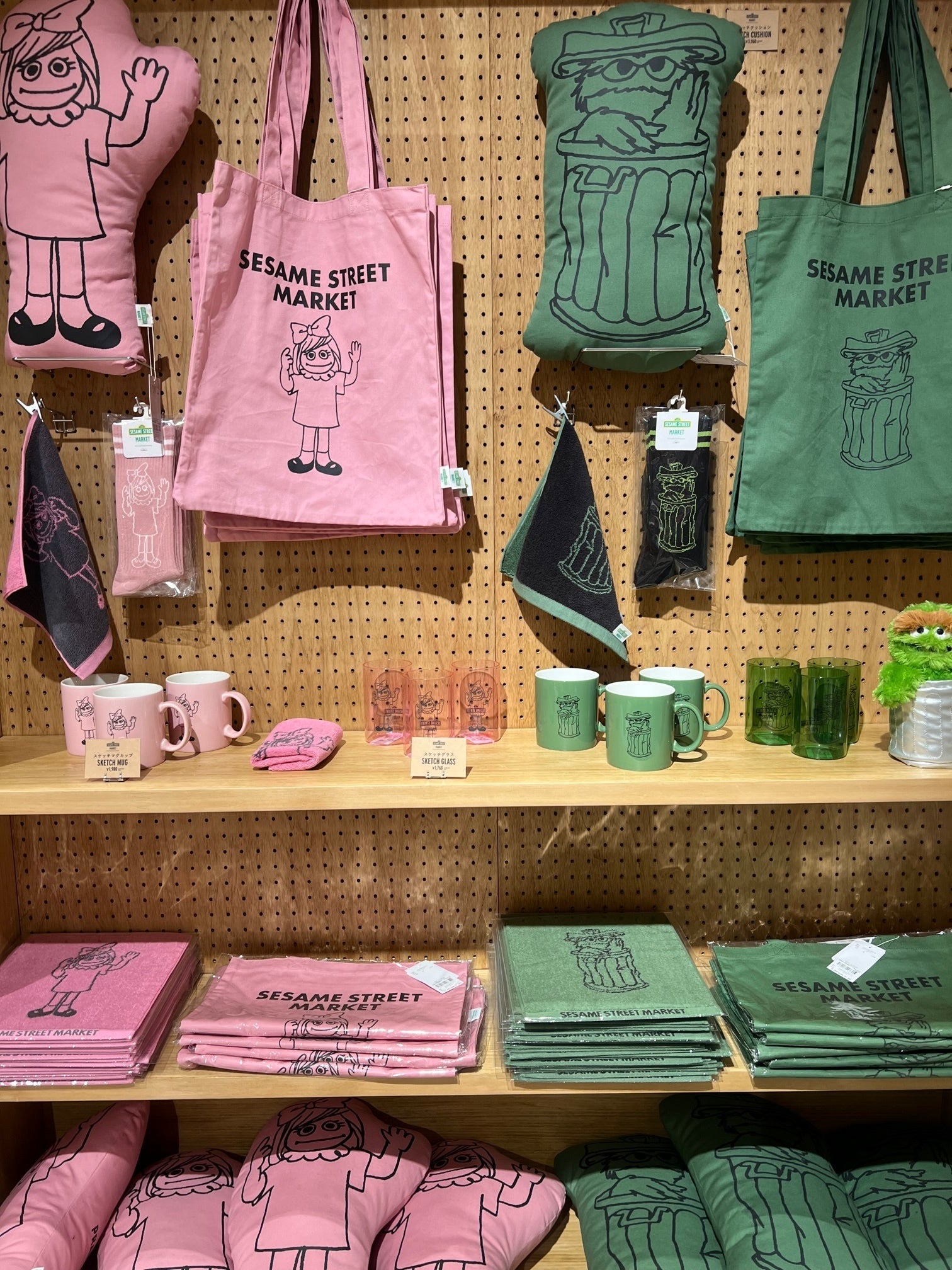 セサミストリートのヴィンテージ絵本からインスパイアされたオリジナルアートを一から描き起こした線画タッチのスケッチシリーズは、アイテムやキャラクターのバリエーションも豊富で、ぬいぐるみ同様オープン後から非常に好評を博しています。