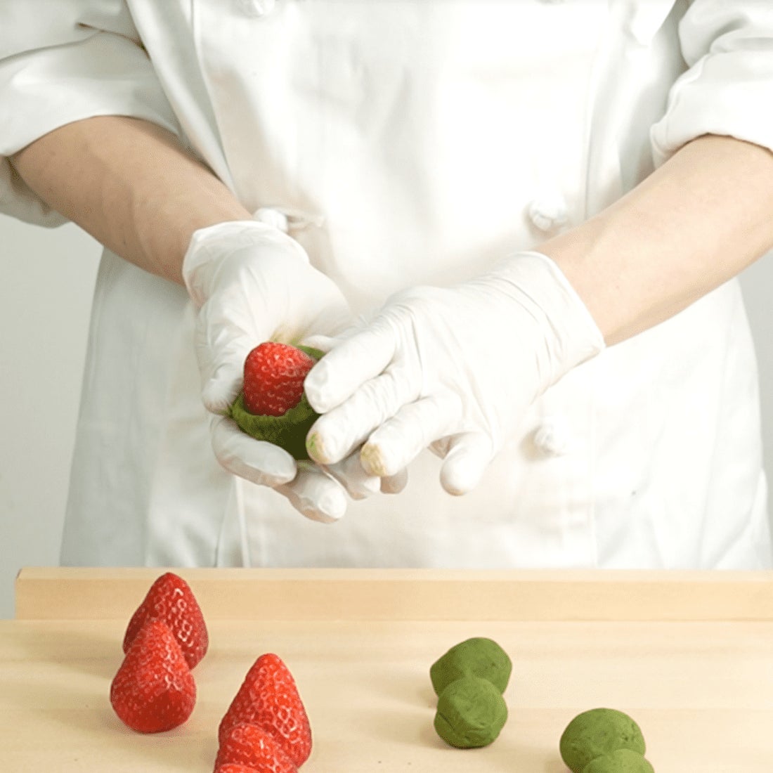 宇治抹茶のほろ苦く繊細な味わいと鮮やかな色味を損なわぬよう手際よく作られた抹茶餡、そして風味がよく粒の大きさの揃った十勝産小豆を使用したこし餡はどちらも自信作です。今年のコクのある紅ほっぺとのバランスを考えて、いちご琥珀餅用にオリジナルのあんこを炊き上げました。餡は甘さを控えめにし、紅ほっぺとわらび餅の水分を受けても味がぼやけることのないよう、少し固めに仕上げています。
