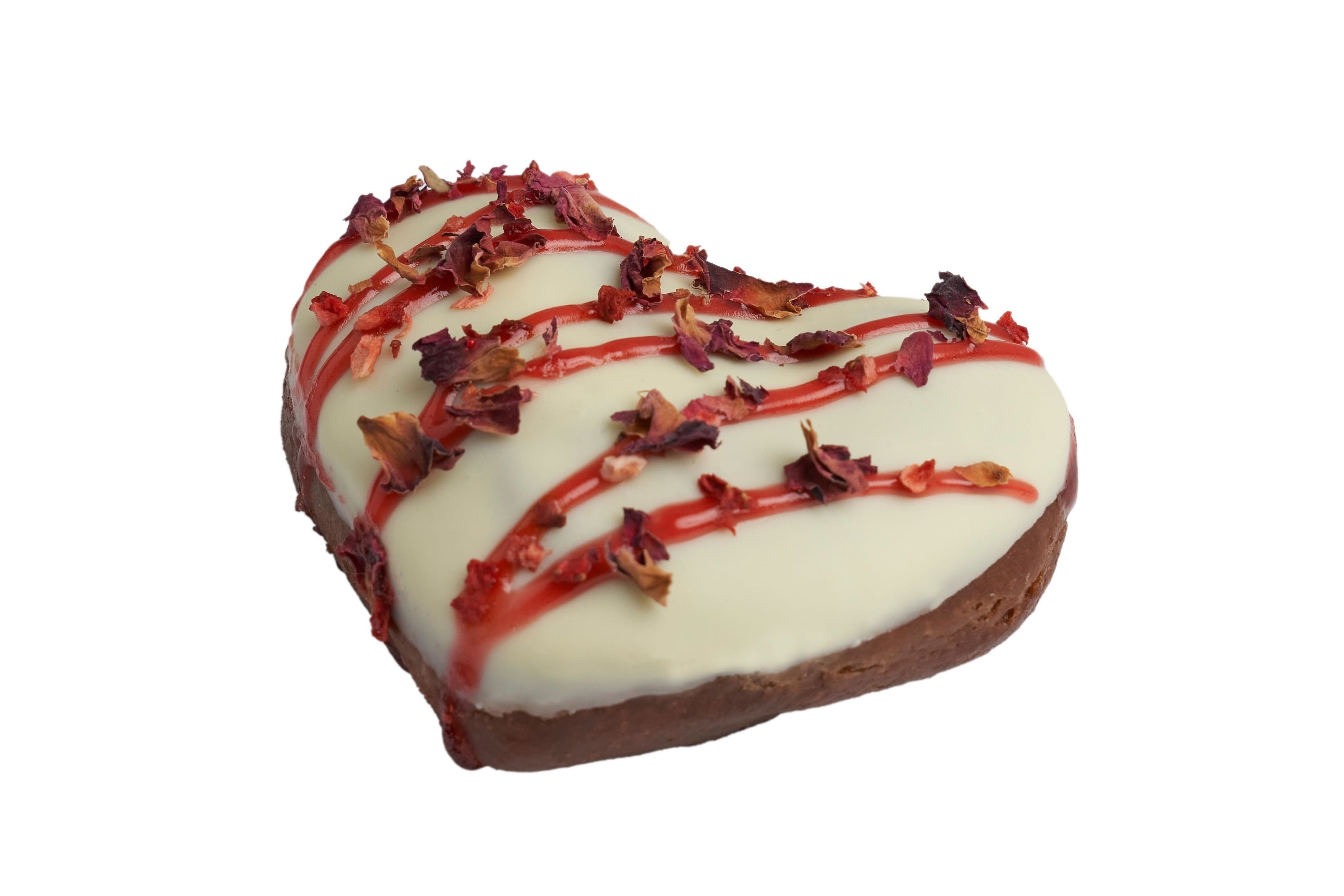 カカオ香るチョコ生地に、なめらかなビターチョコクリームを詰め、ミルキーなホワイトチョコでハートをつつみました。甘酸っぱいストロベリーナパージュで描いたラインと、ローズとストロベリーのトッピングで華やかに仕上げました。