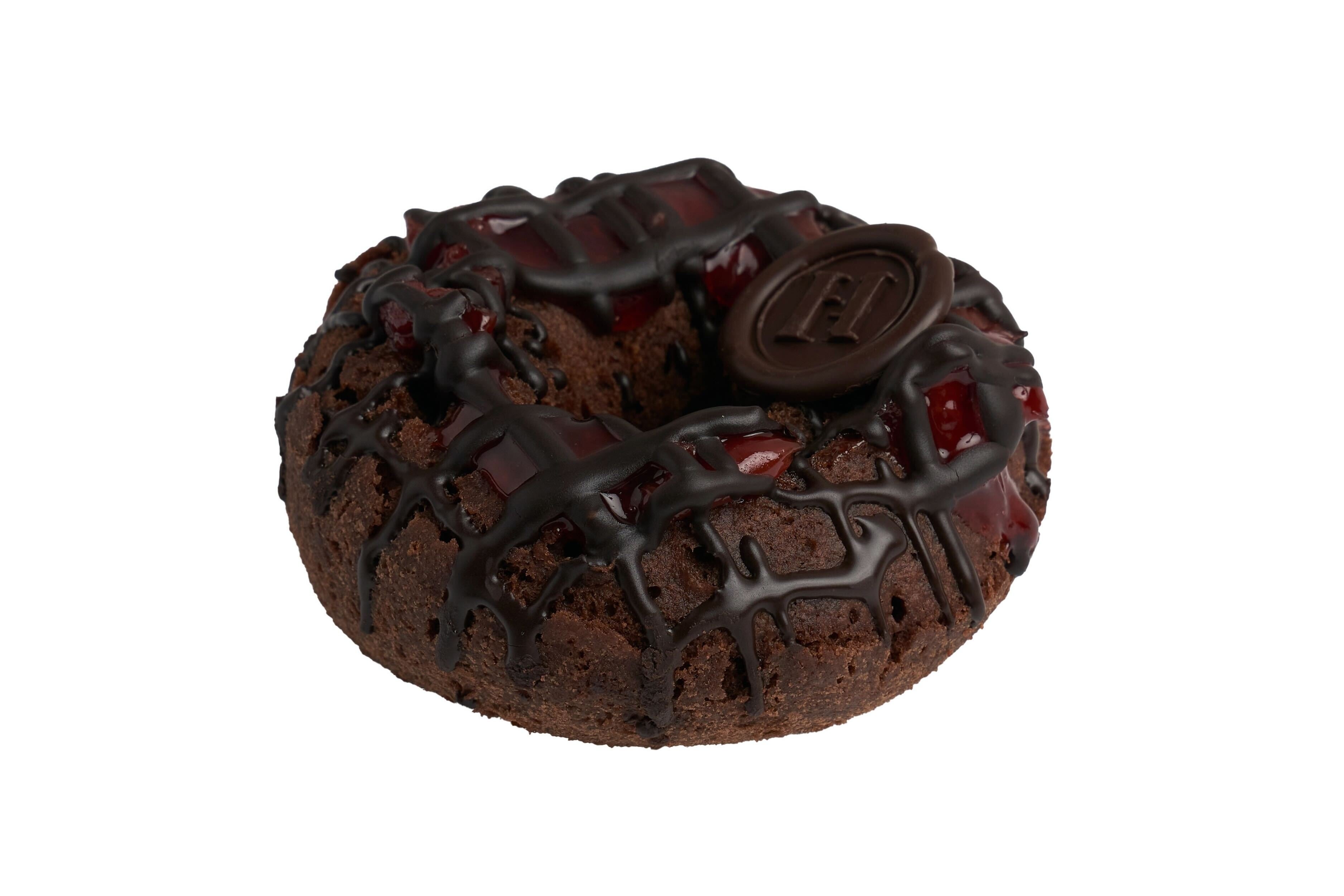 Her lip toのブランドシグネチャーであるチェリーの味わいを落とし込んだコラボドーナツ。しっとり食感のチョコケーキ生地に、フルーティーなチェリーソースを合わせ、ビターチョコのラインを重ねています。Her lip toのロゴが入ったシーリングチョコレートがバレンタインを盛り上げます。