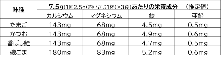 カルシウム、マグネシウム、鉄分、亜鉛を配合。ベーシックな4種の味種展開で、いつものごはんに使いやすいふりかけです。