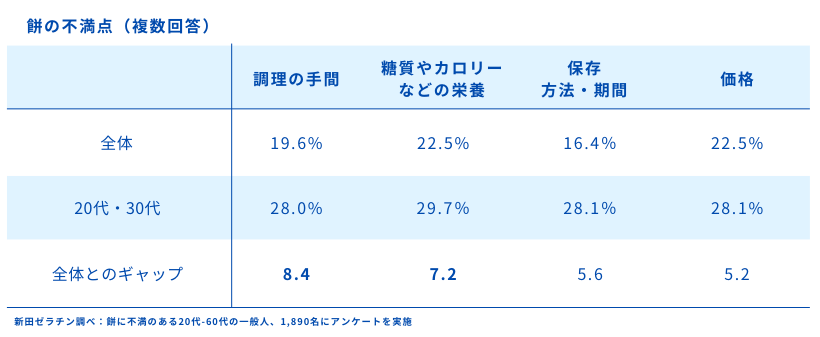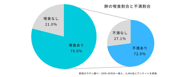 20代から60代の一般人3,481人を対象に行った調査では、79%の人が餅の喫食経験がある一方で、73%の人が餅に対して何らかの不満を抱えていました。さらに20代・30代の人は、全体と比べて、餅の調理方法への不満が8.4ポイント、糖質やカロリーが高いなどの栄養に対する不満が7.2ポイントも高いことが明らかになりました。