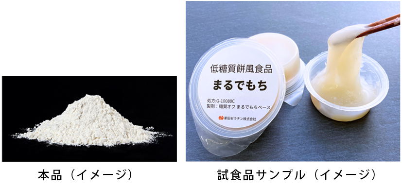 そこで、新田ゼラチン株式会社は、従来の餅に比べて糖質とカロリーを抑えつつ、消費者が調理をしなくてもそのままでもちもちとした食感を楽しむことができる餅風食品を製造するための食品加工用の粉末製剤を、約 2 年の開発期間を経て発売しました。
