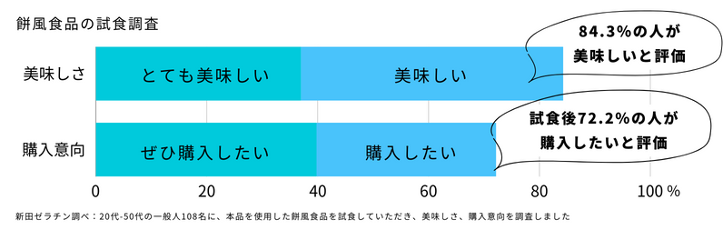 20代から50代の一般人108名に、本品を使用した餅風食品の試食調査を実施しました。その結果、84%の人が美味しいと評価し、さらに72%の人が購入したいと回答、美味しさや購入意向調査においても非常に高い評価を得ることができました。