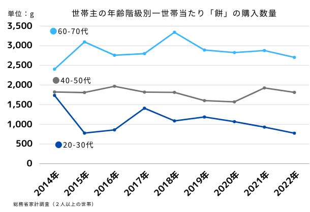 日本の餅市場は年間約500億円規模ですが、総務省の家計調査によれば、2022年における一世帯(2人以上の世帯)当たりの餅購入数量は、世帯主が20代・30代の場合は776g、60代・70代の場合は2,703gとなっており、若者層において餅離れが起きています。