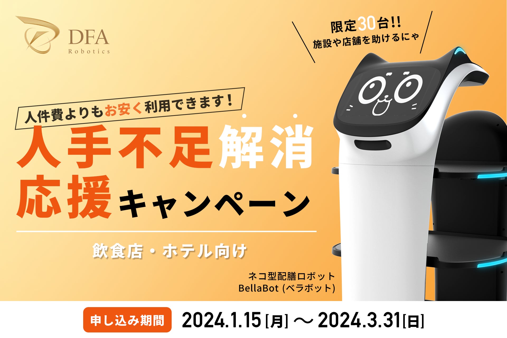 飲食店DXを推進するロボティクスソリューションカンパニーである株式会社DFA Robotics(本社:東京都渋谷区、代表取締役社長:波多野昌昭)は、ネコ型配膳ロボット「BellaBot(ベラボット)」を特別価格にて3年間レンタルできる「人手不足解消応援キャンペーン」を、本日より期間限定で実施いたします。