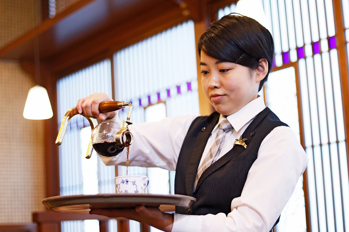 コーヒーマイスターの資格をもつサイフォニストが一杯ずつ丁寧に抽出し、お客様の前でお注ぎしますので、五感でコーヒーをお楽しみください。