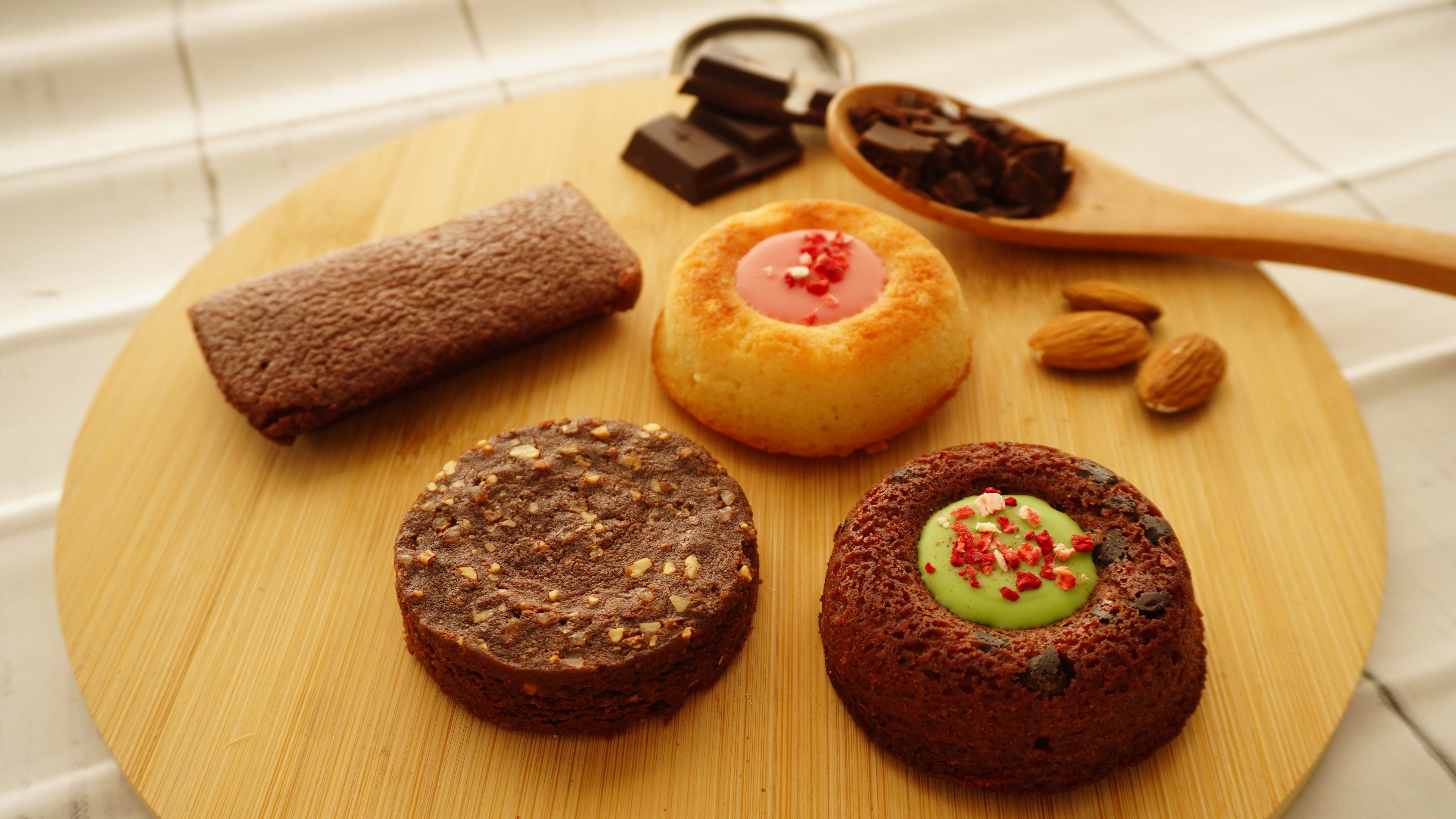 ・チョコティグレ(グリーン):ココア味のフィナンシェ生地を丸く焼き、中心の窪みにチョコレートを流しいれ苺のフリーズドライで飾り付けしたアースカラーがかわいらしい焼菓子。(単品:324円)