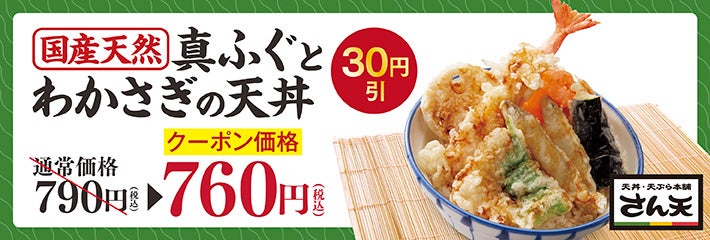 更に「天丼・天ぷら本舗 さん天」公式アプリでは、フェア商品でお使いいただける30円引きクーポンを配信いたします。ぜひ、お得にご利用ください。