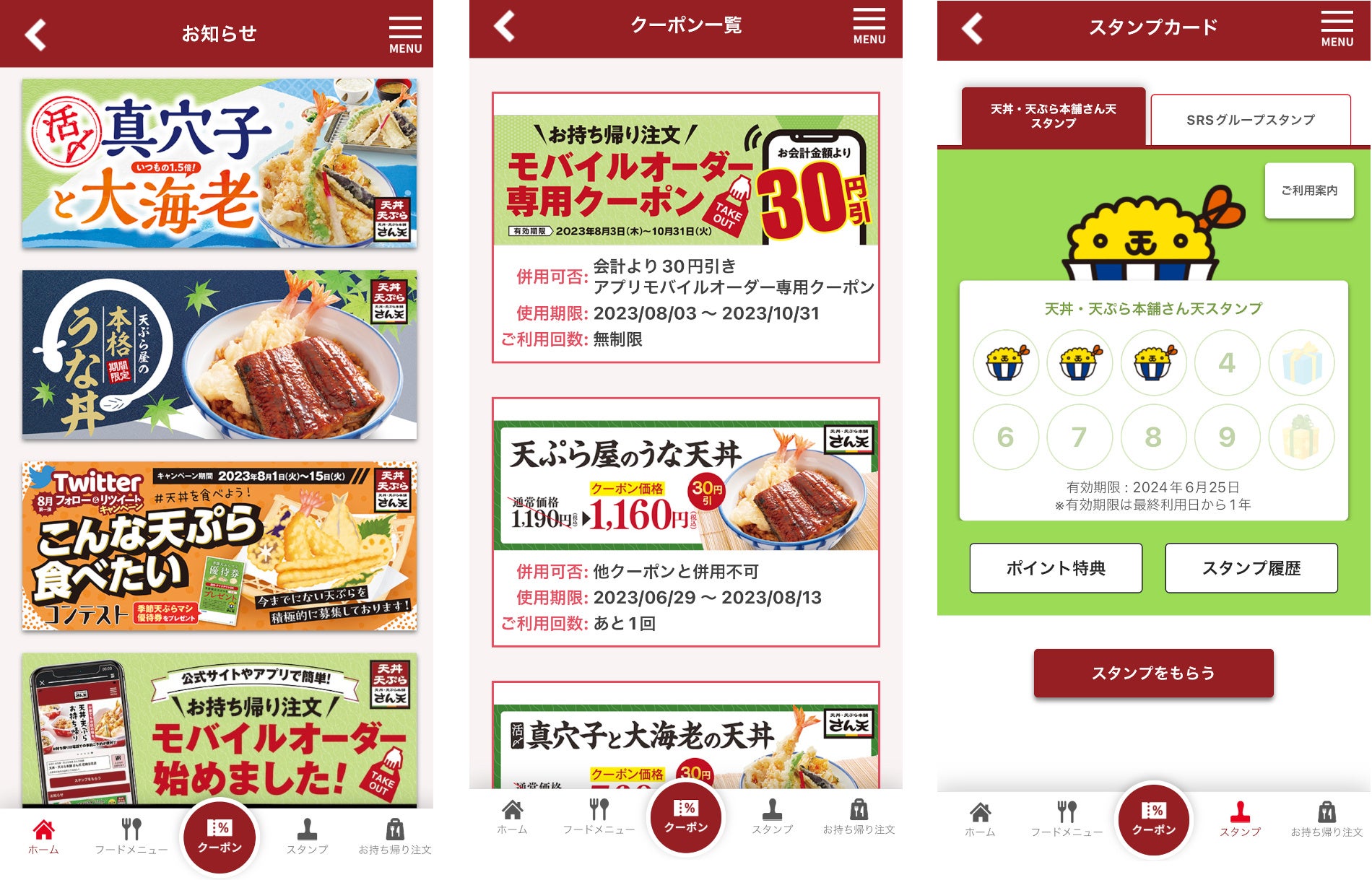 「天丼・天ぷら本舗 さん天」公式アプリで、使えるお得なクーポンを配信