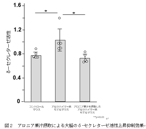 哺乳類の脳ではδ-セクレターゼというアミロイド前駆体タンパク質(AAP)を分解する酵素がアミロイドβ産生に重要な役割をしています。マウスの脳内におけるδ-セレクターゼの活性に対するアロニア果汁摂取の影響を調べると、図2に見るようにアルツハイマーモデルマウス(5XFAD)の脳内ではδ-セクレターゼの活性は強く活性化されましたが、アロニア果汁を摂取したアルツハイマーモデルマウス(5XFAD-AJ)のδ-セクレターゼの活性はコントロールマウス(WT)と同じレベルでした。アロニア果汁の摂取はδ-セクレターゼを阻害することがわかりました。