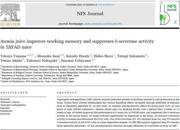 (論文タイトル)アロニア果汁は5XFADマウスの作業記憶を改善し、δ-セクレターゼ活性を抑制する.