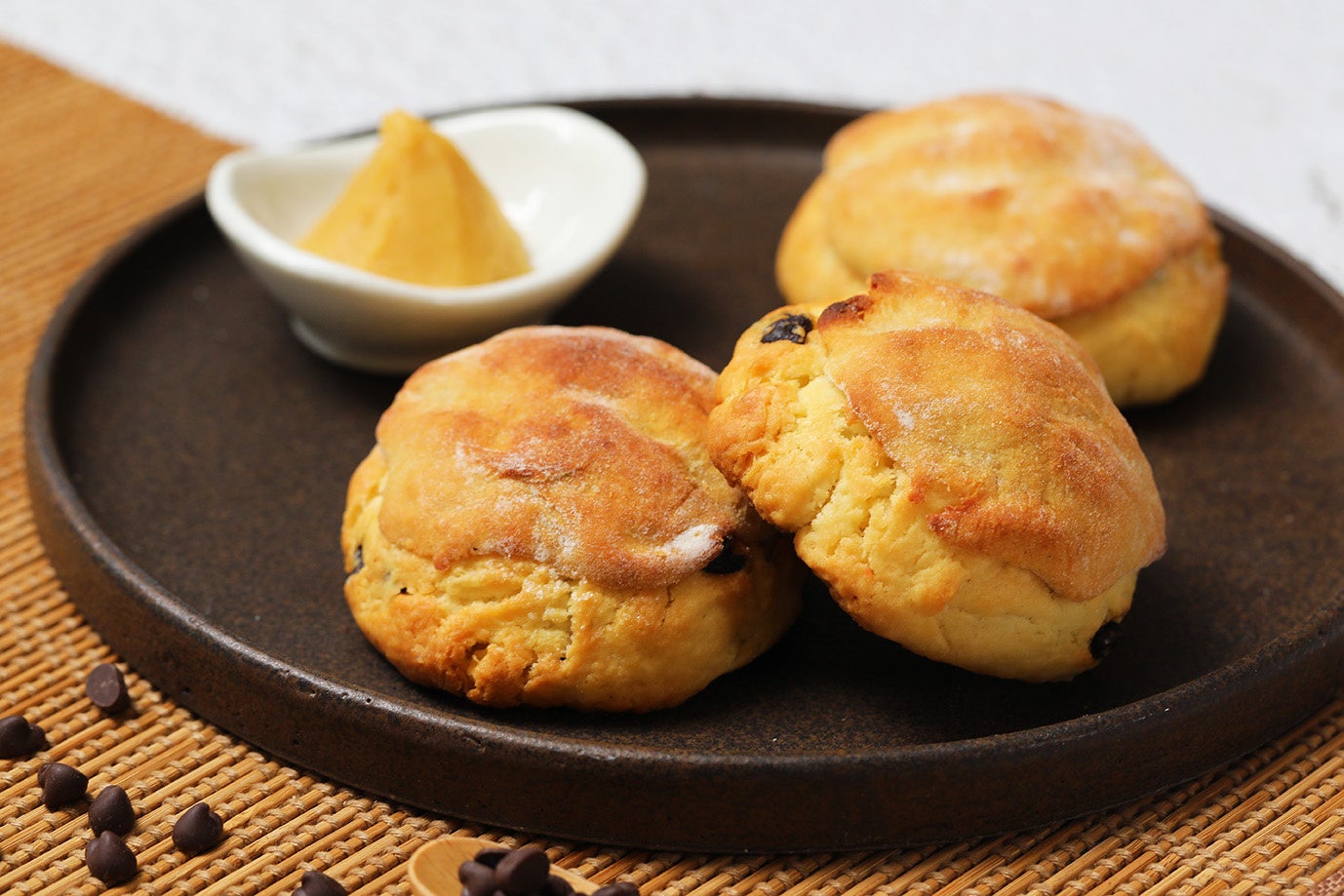 こだわり:定番商品『スコーン』の冬季限定フレーバー。優しい味わいのスコーン生地にチョコを練り込み、グランディールオリジナルの『味噌ダマンド』をかぶせて焼き上げました。ほのかに香る味噌の風味とまろやかなコクのチョコのアンサンブル。意外な組み合わせがクセになるスコーンです。