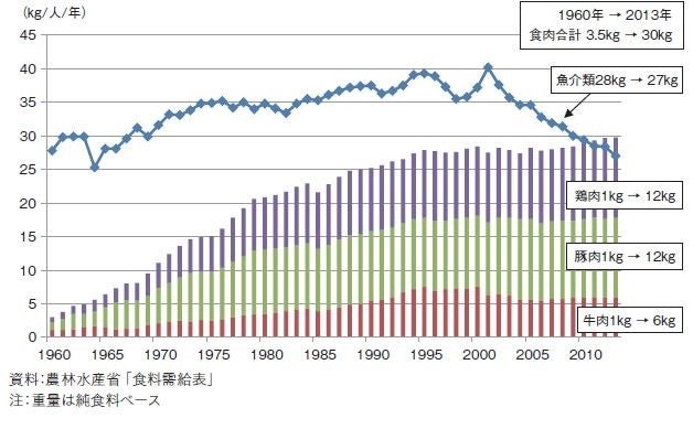 日本人の食生活はここ50年で大きく変化しています。1960年には1人1年あたりの食肉供給量は3.5kgでしたが2013年時点で30kgまで増加しました。