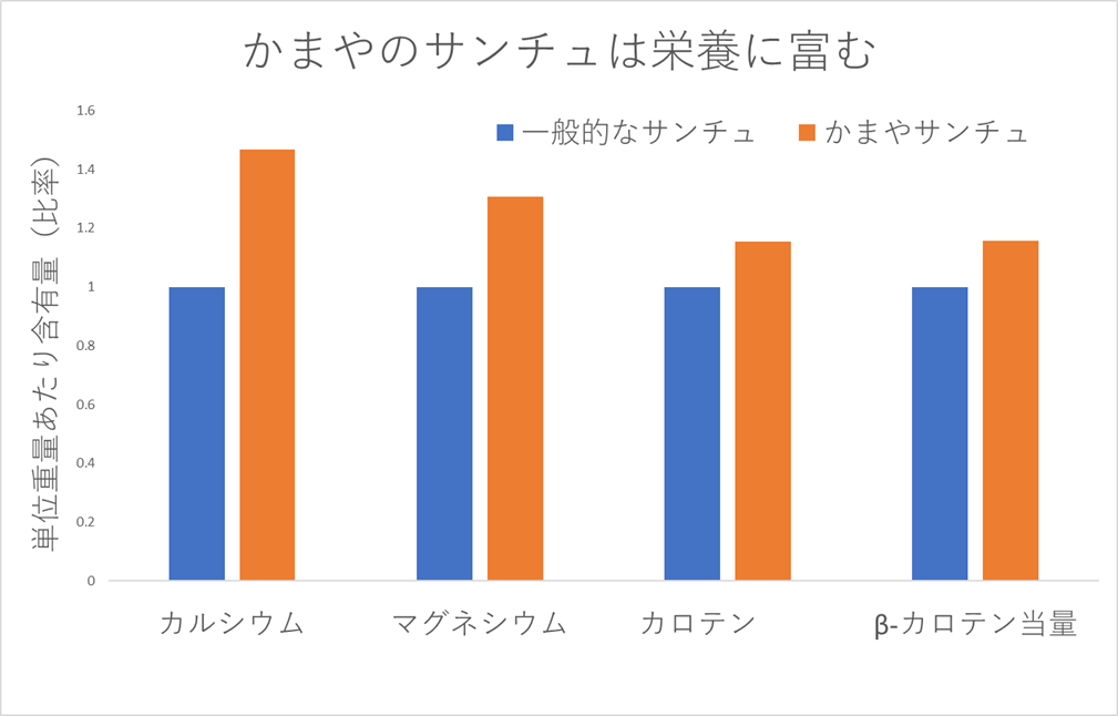 かまやのサンチュはミネラルやビタミンの含有量が多くなっています。成分分析の結果、一般的なサンチュに比べ、カルシウム1.5倍、マグネシウム1.3倍、カロテン1.1倍と栄養に富んでいることが判明しています。