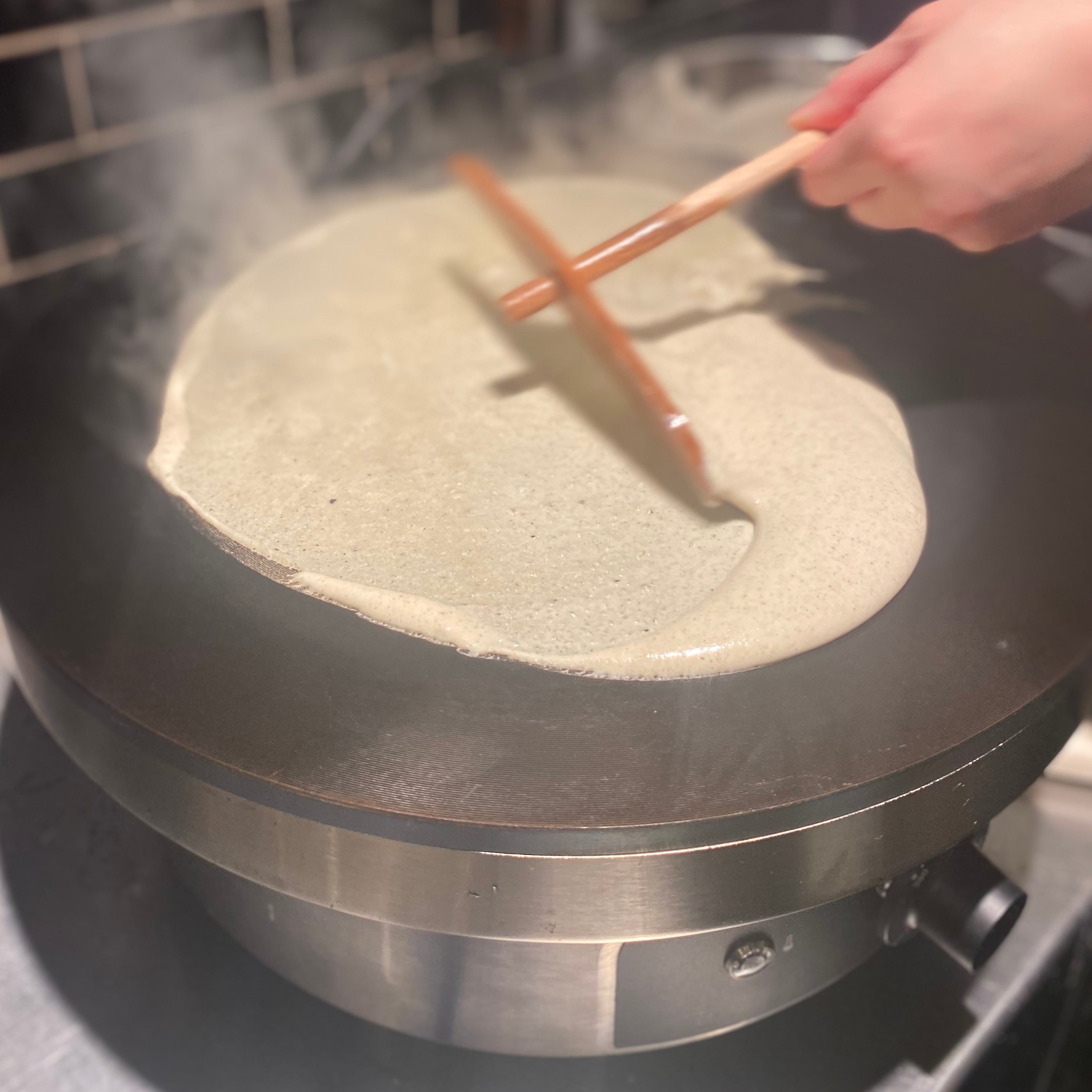「ガレットコンプレット」は、長野県産の香り高い良質な蕎麦粉と、信州ポークロース肉、深いコクと上質でクリーミーな味わいのカルピスバターで仕上げています。厳選した材料にこだわり、一枚一枚丁寧に焼きあげるガレットは、高温の鉄板で表面はパリッと、中はもちっとした食感に焼き上げ、蕎麦の風味を存分にお楽しみいただける一品です。オーダーをいただいてからお作りしますので、焼き立てをお召し上がりいただけます。