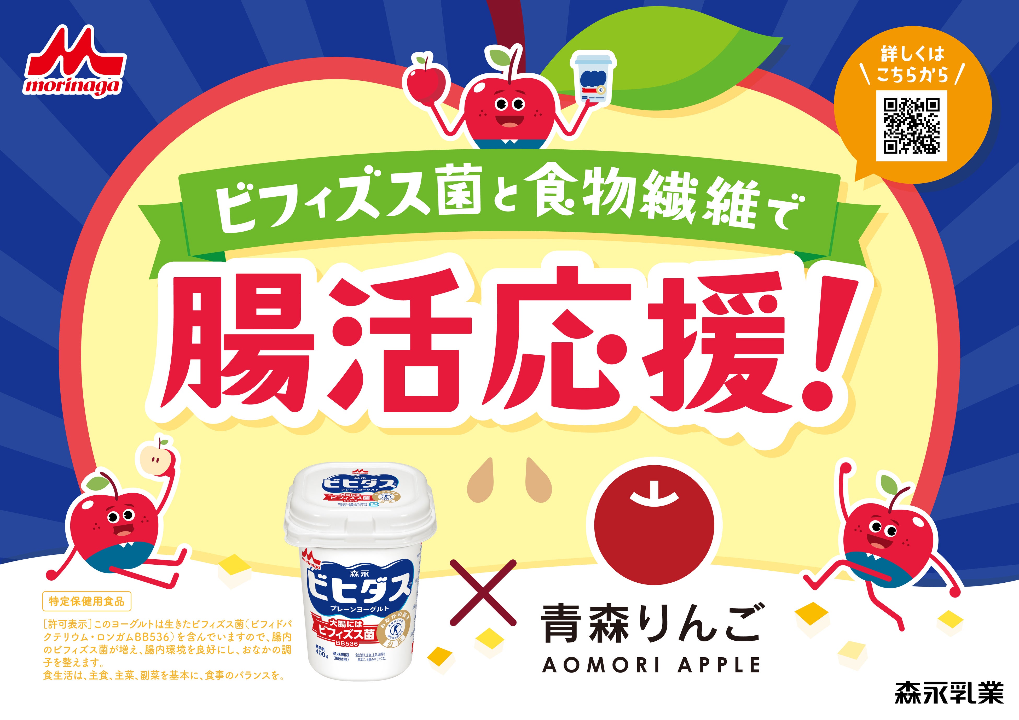 今回の腸活応援コラボメニューに使用している「ビヒダス プレーンヨーグルト」は特定保健用食品であり、生きた『ビフィズス菌 BB536』を含んでいますので、腸内のビフィズス菌が増え、腸内環境を良好にし、おなかの調子を整えます。また、青森りんごに含まれる食物繊維はビフィズス菌など善玉菌のエサとなるため、「ビヒダス ヨーグルト」と「青森りんご」は相性抜群で、おなかにうれしい組み合わせです。