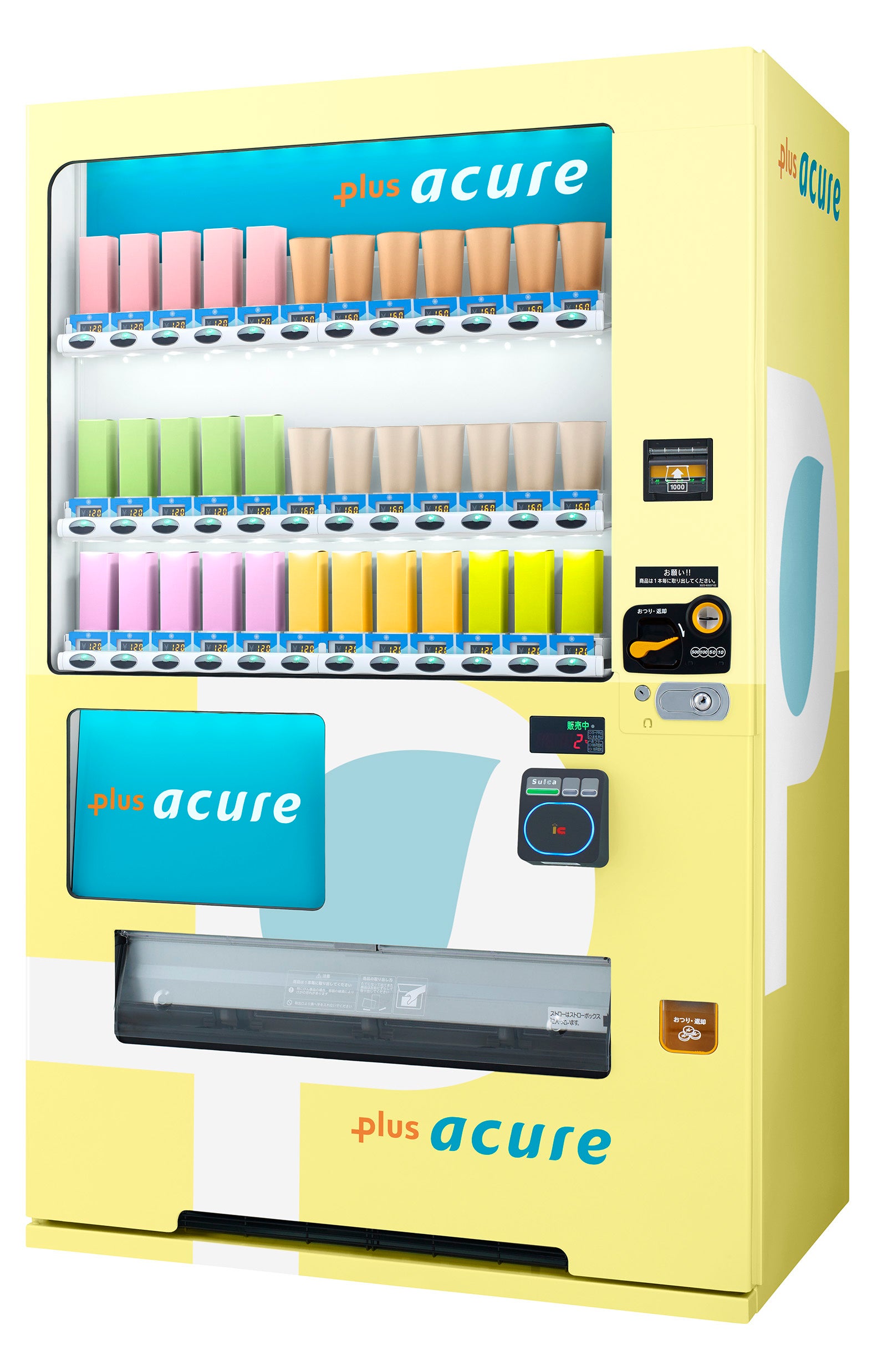 「プラスアキュア」は、1つのメーカーの商品だけではなく、複数のメーカーの商品を取り扱う“ブランドミックス”自販機。エキナカユーザーの需要に合わせた商品を採用しています。年に4回程度改廃を行い、季節や設置箇所毎の売れ筋に合わせて商品をラインナップしています。缶やペットボトルの飲料を取り扱うアキュアの自販機とは、商品は全く異なり、容器は紙パックやカップ系のものが多く並びます。また、一部商品は10℃以下のチルド配送でお届けしており、中には、賞味期限が2週間程度と鮮度の高い商品もあります。代表的なカテゴリーには、乳酸菌飲料やカフェラテ、豆乳飲料などが挙げられます。