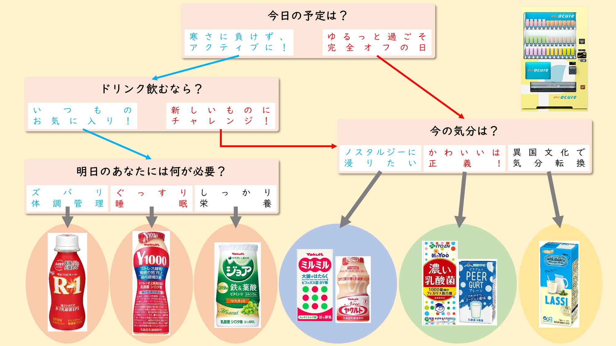 昨今の健康ブームから、様々な飲料メーカーが多様な乳酸菌飲料を販売しており、どんな時にどの乳酸菌飲料を飲んだらよいか迷ってしまう「乳酸菌迷子」の方が増えているのではと考え、今の気分をフローチャートに沿って選ぶことで、プラスアキュアがおススメする乳酸菌飲料が一目でわかる「プラスアキュア乳酸菌飲料マップ」を作成しました。