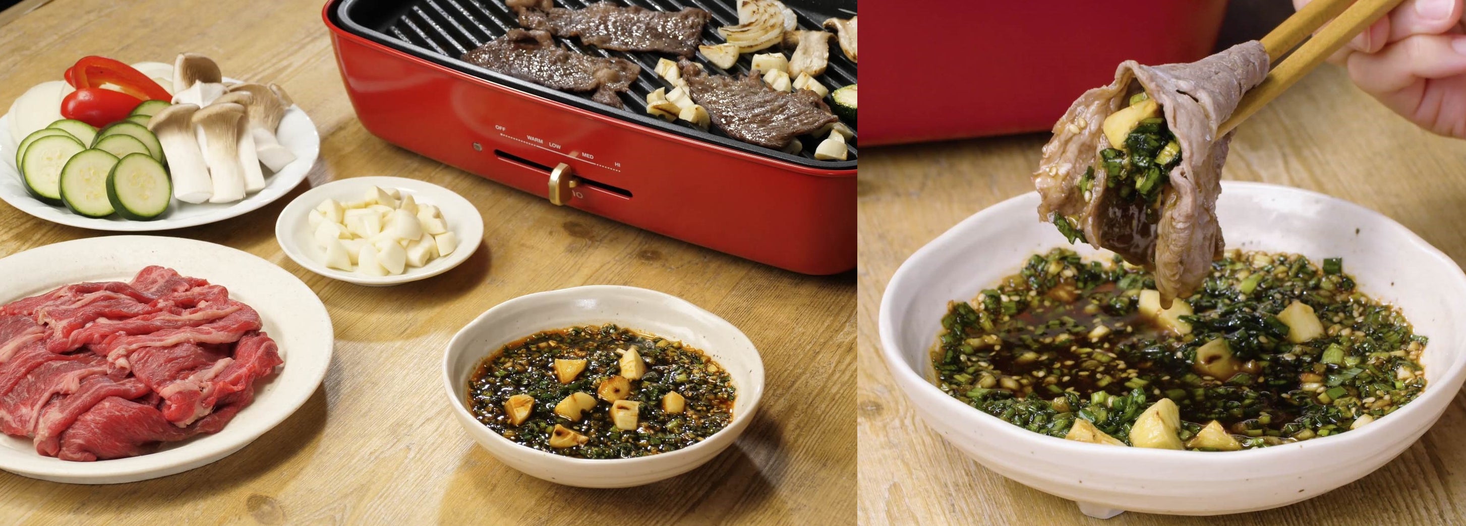 ③「ジャン 焼肉の生だれ」を使用したアレンジレシピとして平日向けメニュー「生だれジューシー焼肉丼」、休日向けメニュー「マヌルバギ」を提案しています。マヌルとは韓国語で「にんにく」を指し、マヌルバギは、にんにくと食べるモランボンオリジナルの韓国式薄切り焼肉です。