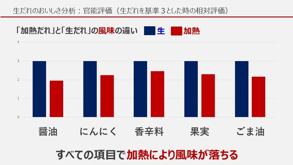 生だれのおいしさ分析(官能評価)において「加熱だれ」と「生だれ」で風味の違いが明らかになりました。(モランボン味覚審査員による相対評価 単位5段階評点 加熱だれ:80℃120分加熱 N=11)