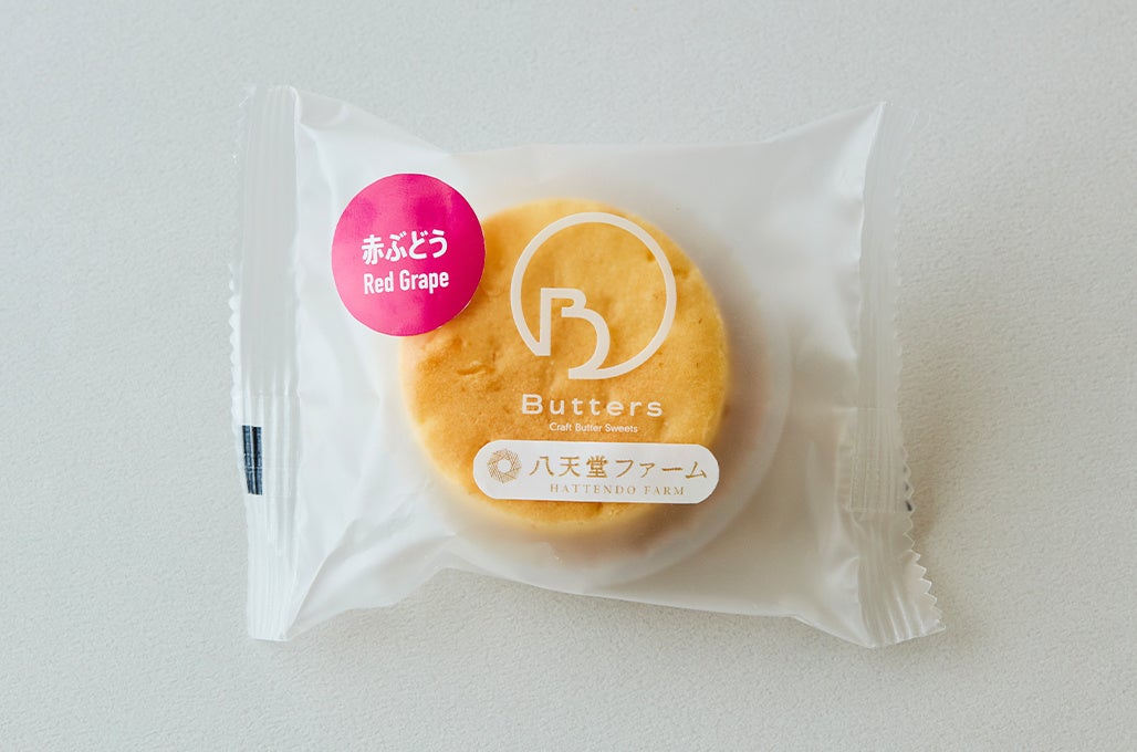 バターサンドウィッチ 赤ぶどうでは、八天堂ファームが農福連携ではぐくむ「八天堂ぶどう園」の赤ぶどうを使用しています。糖度の高い赤ぶどうのおいしさをぎゅっと濃縮したジャムに仕立て、北海道産の濃厚なバタークリームと合わせました。赤ぶどうの爽やかで上品な酸味と濃厚なバタークリームのマリアージュをぜひご賞味ください。
