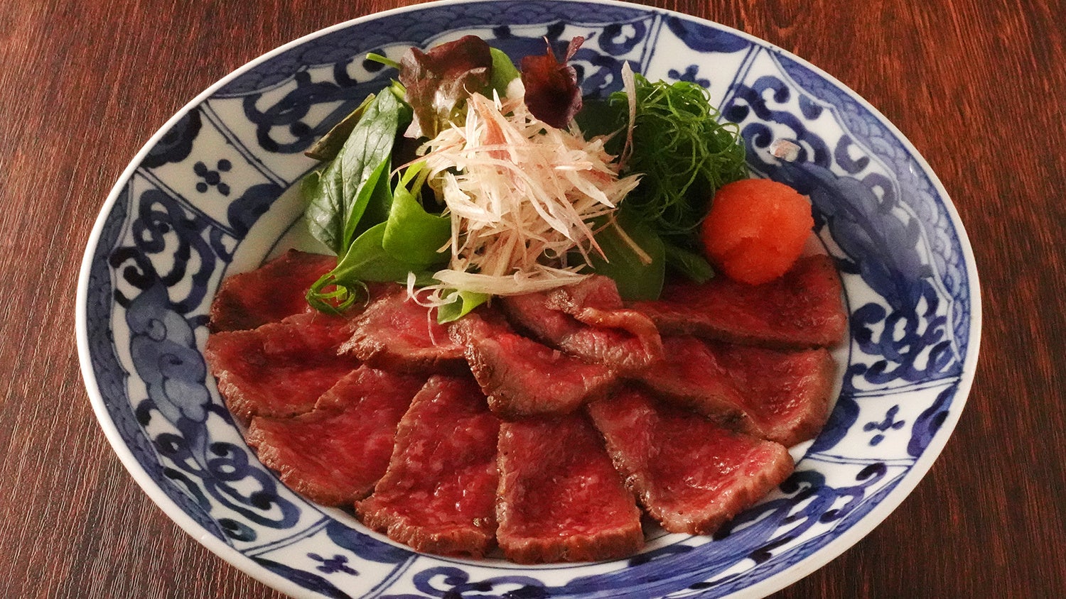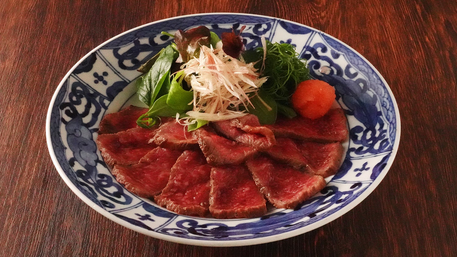ブランド和牛・松阪牛の霜降り赤身のもも肉をじっくり焼き上げました。ローストビーフにはポン酢をかけてお召し上がりください。