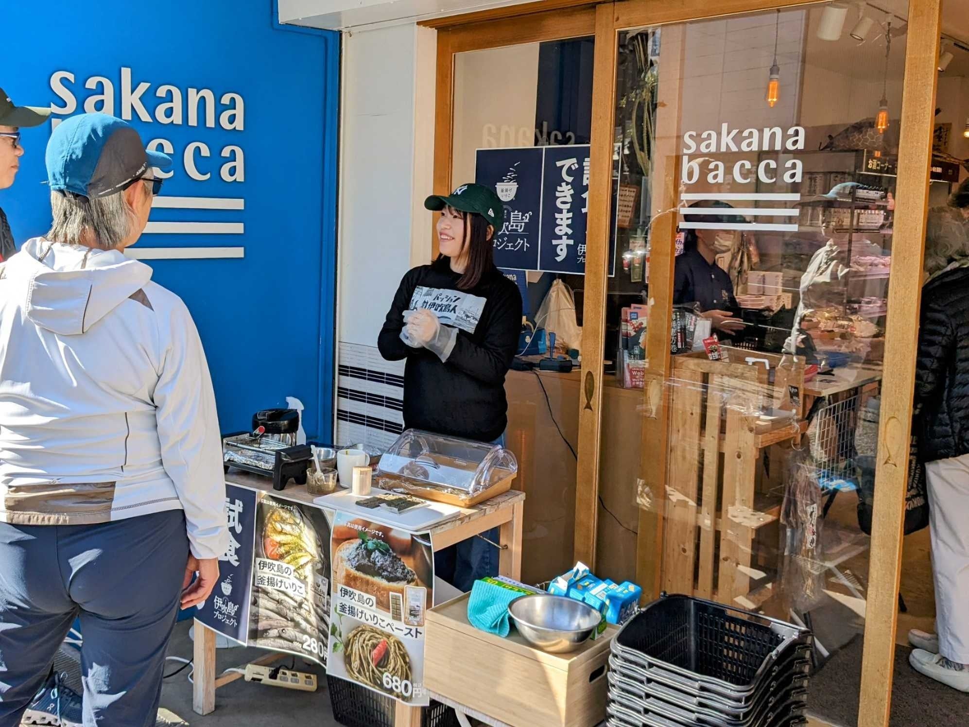 当日は、網の上で温めた『釜揚げいりこ』とクラッカーの上にのせた『釜揚げいりこペースト』の2商品をサカナバッカの来店客へ提供いたしました。試食をした来店客からは「全く臭みがなくて美味しい」「酒の肴にして食べたい」「フワフワしていて食べやすい」と子供から高齢者まで、幅広い層から好評の声をいただきました。来店客のなかには瀬戸内海方面出身の方もいて「こういった取り組みを継続して欲しい」と応援のお言葉もいただきました。