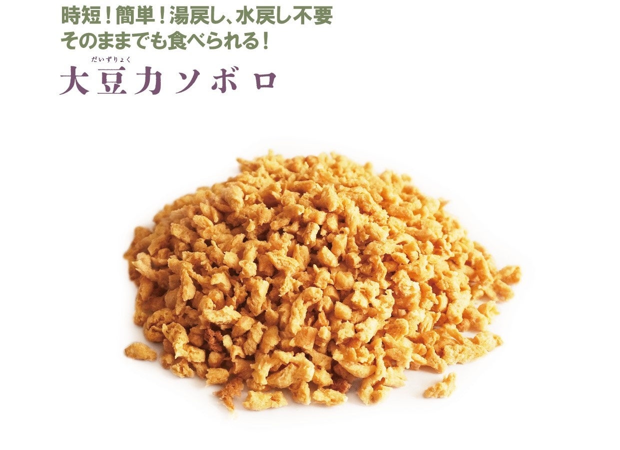 例えば、通常の乾燥大豆ミートは、お湯で茹でて水気を絞るという工程が必要です。この手間を全て飛ばして、いきなり混ぜて使えるインスタントな乾燥大豆ミートを開発しました。それが大豆力ソボロです。