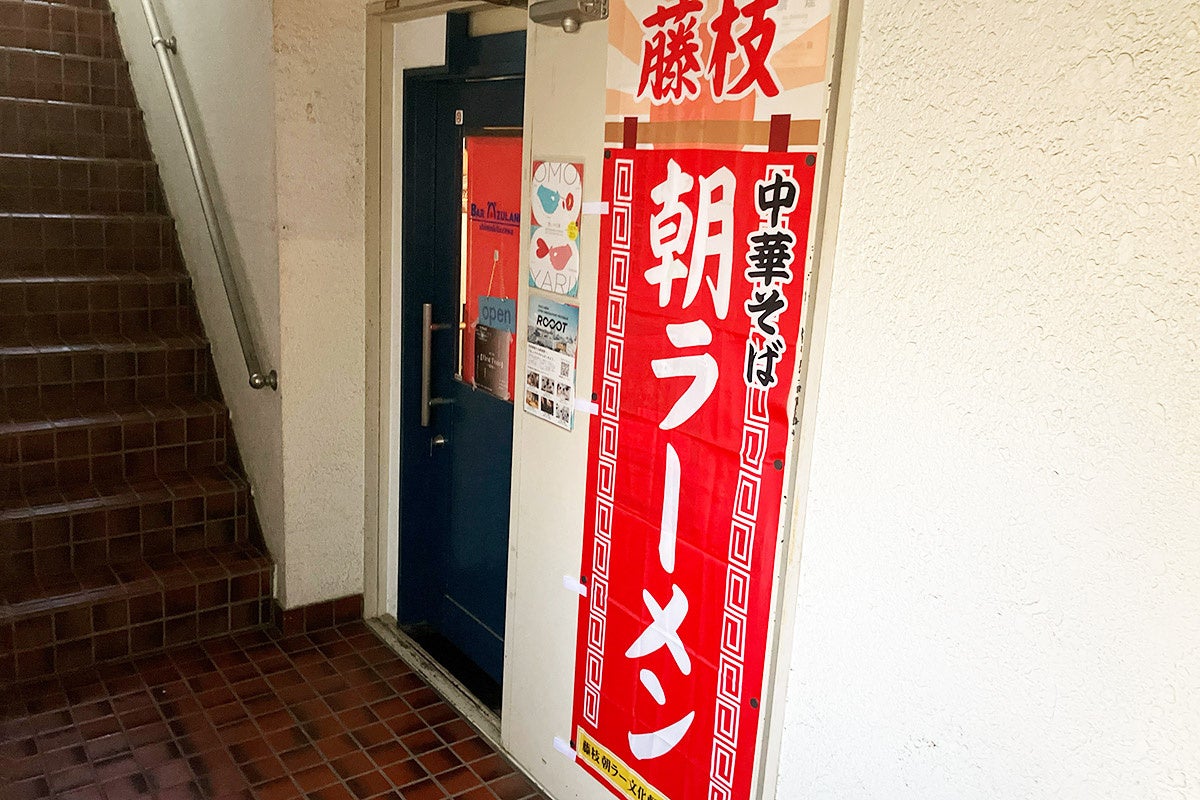 『まる藤ラーメン 下北沢』入口(営業時には朝ラーメンののぼりを掲出)