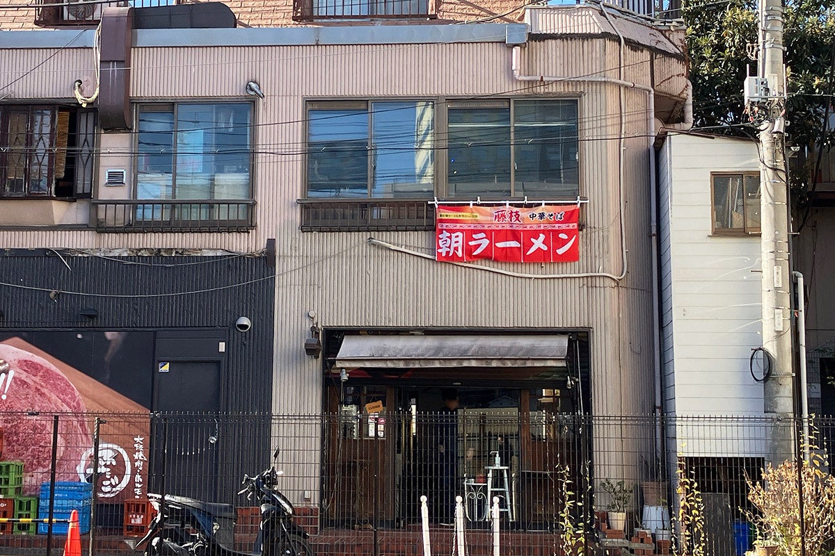 『まる藤ラーメン 下北沢』外観(営業時には朝ラーメンののれんを掲出)