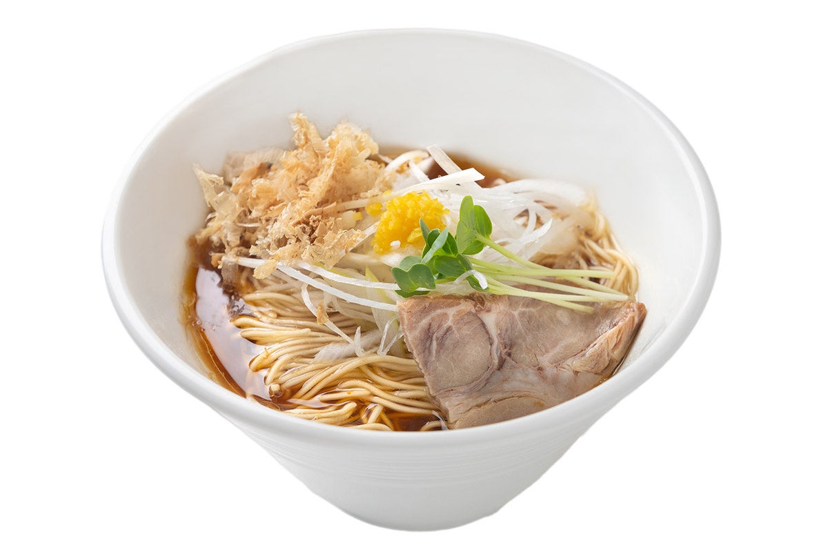 温かいラーメンは動物系と節系のダブルスープで、チャーシューにメンマ、白髪ネギ、カイワレ大根、刻み柚子、そして鰹節をトッピング。博多ラーメンで使うような極細ストレート麺を使い、のどごしの良さが特徴的。