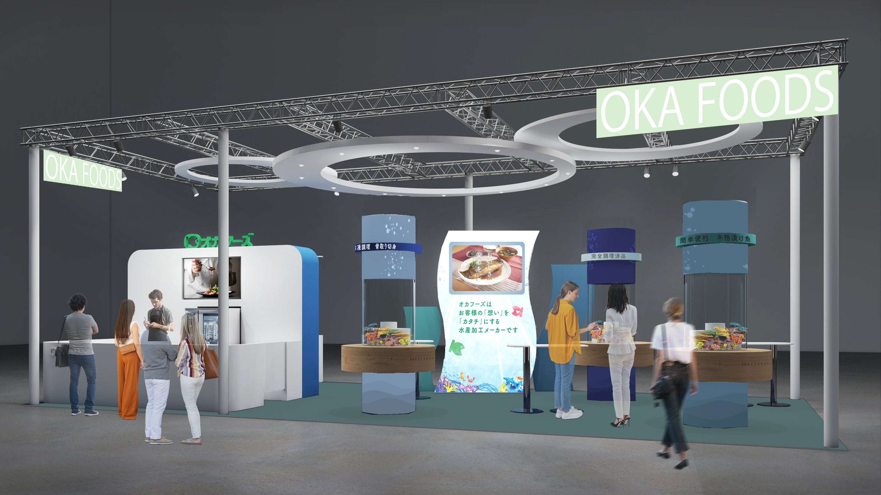 東ホールの東4番口から入ってすぐ右手にオカフーズのブースを出展し皆様をお待ちしております。今回のブースは海の中をイメージしており、中央部の展示スペースには水槽型の什器で製品の紹介をしております。また、1日数回ライブキッチンでの調理実演に加え、カウンターで常時ご試食いただけるよう準備を進めております。