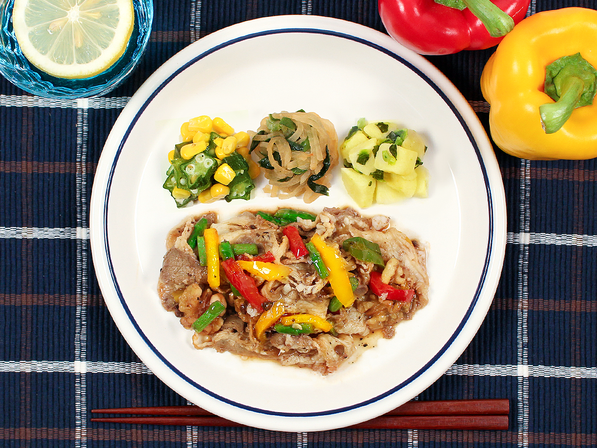副菜は、オクラの入ったコーンの旨塩、にらを混ぜ合わせサッパリ仕上げた大根の香醋だれ、じゃがいもの小松菜あえです。