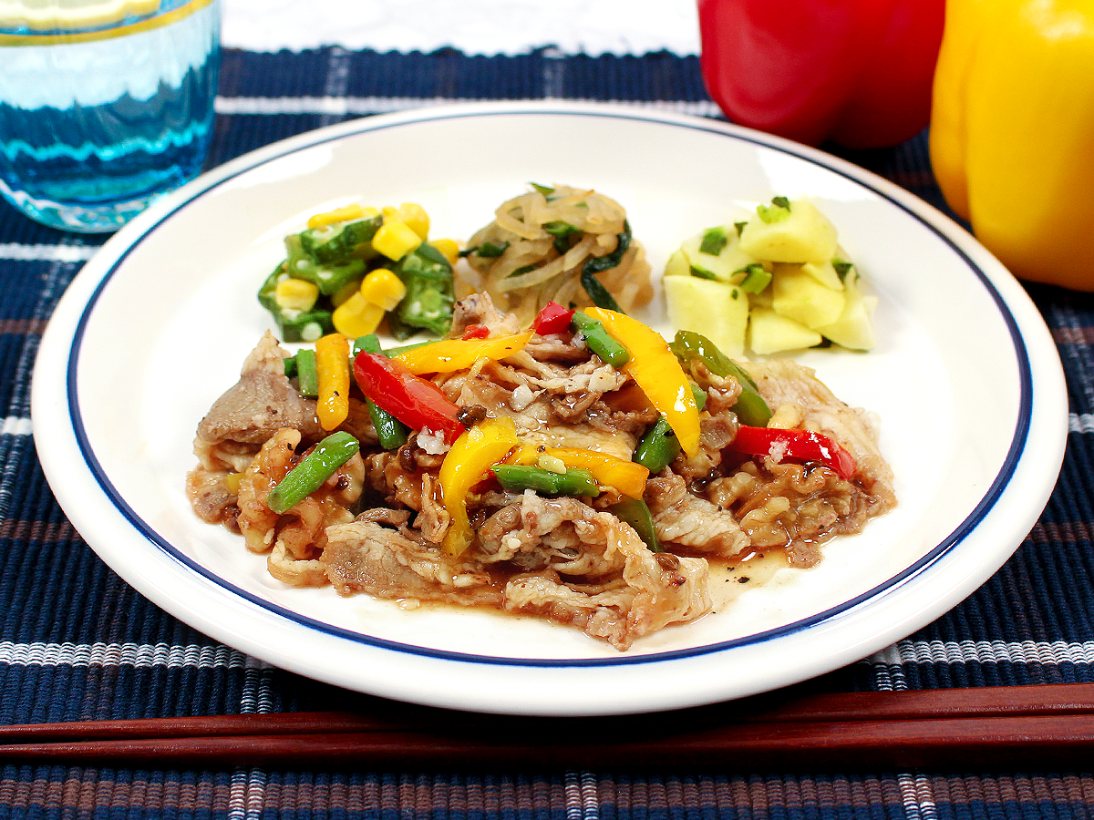 黒胡椒のピリッと効いたソースが牛肉の旨みを引き立てます。パプリカとアスパラの彩りが目にも楽しく、カリッとローストしたクルミの食感がより一層食欲を刺激します。よく混ぜてお召し上がりください。