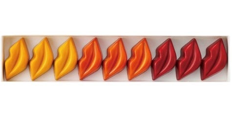 プラリネとキャラメルの2層をチョコでコーティング。素材をイメージしたリップカラーで、赤はフランボワーズ風味、橙色はオレンジ風味、黄色はレモン風味です。