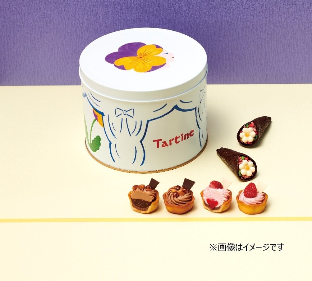 バレンタイン限定デザインの缶に、タルティンストロベリーとプラリネチョコ、花束をモチーフにしたかわいいチョコブーケの3種のお菓子を詰め合わせました。