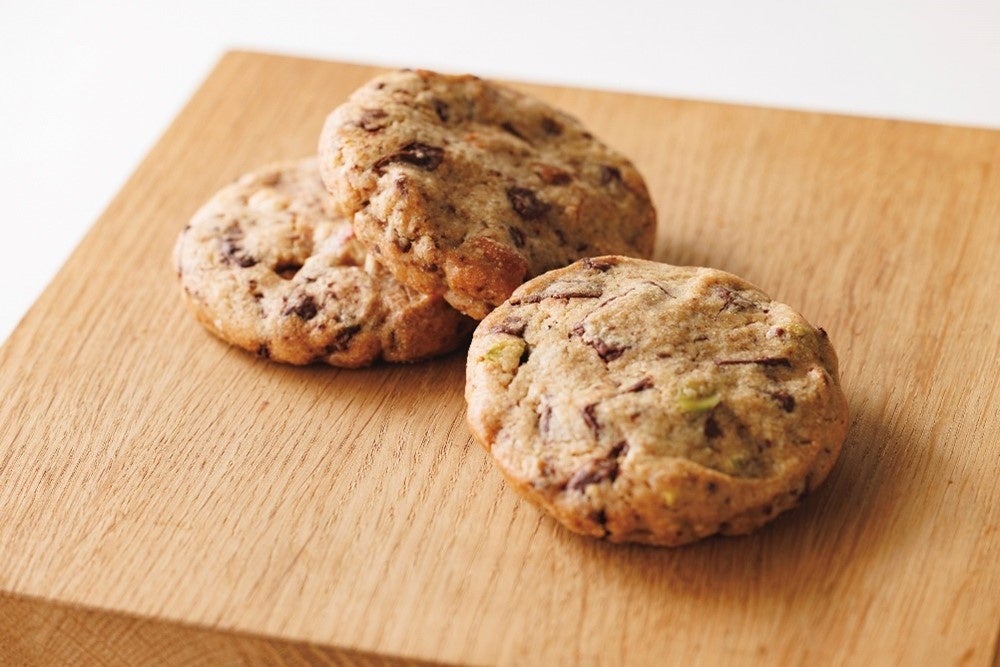 マダガスカル産カカオのショコラとピスタチオ、ジャワ産カカオのショコラノワールとアーモンド、ペルー産カカオのショコラノワールとヘーゼルナッツの3種のクッキー。
