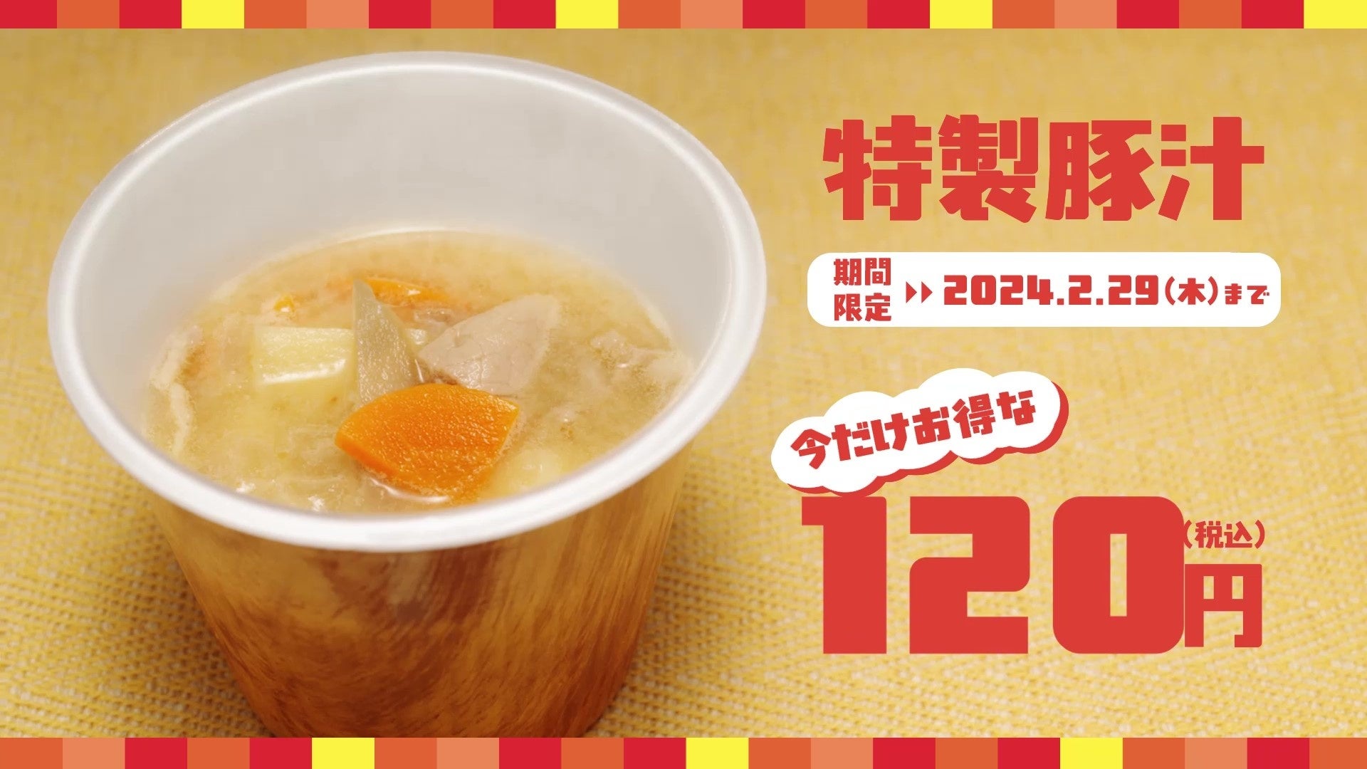 また、CMの最後に期間限定でお得な「特製豚汁」を告知しております。