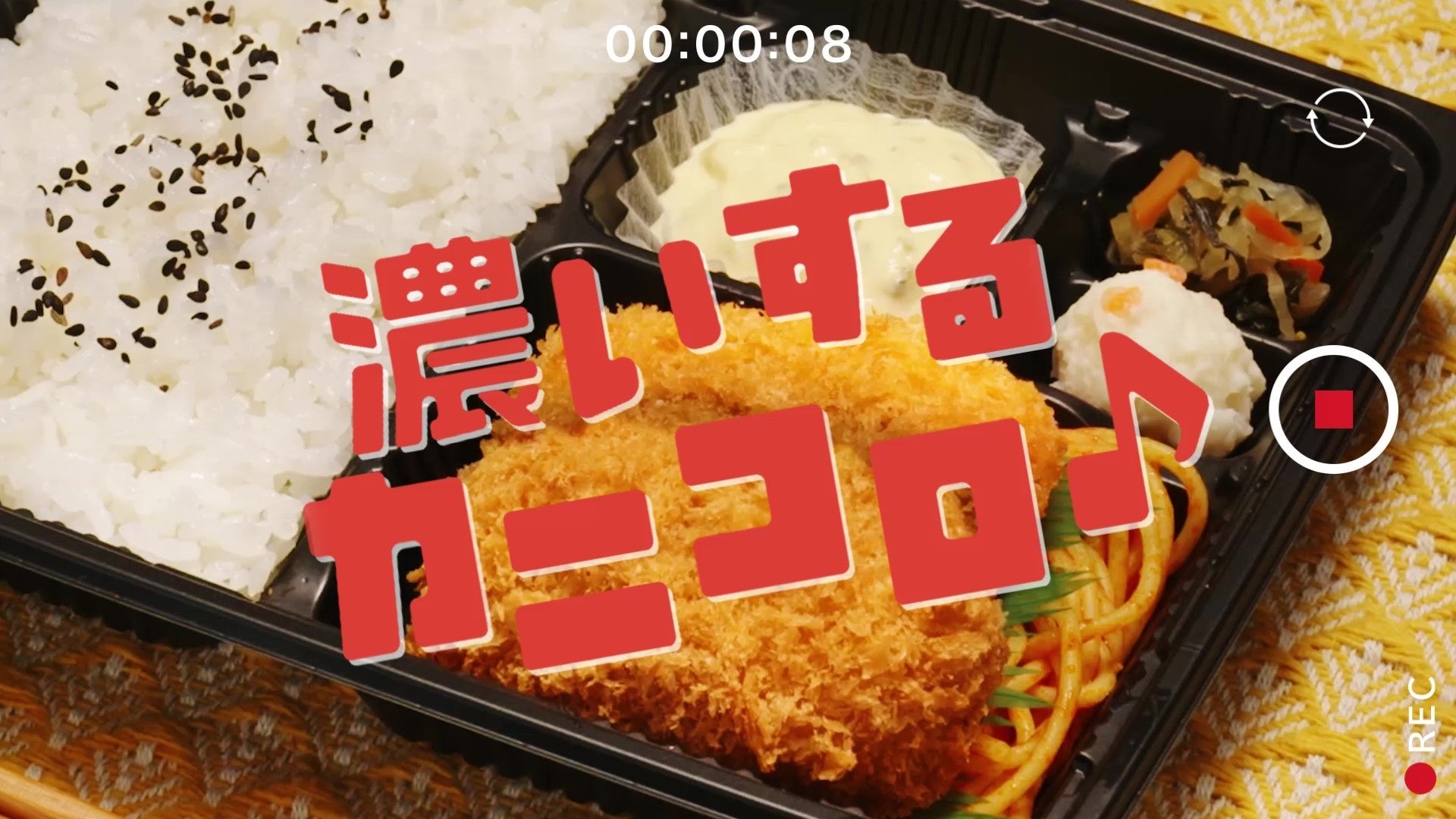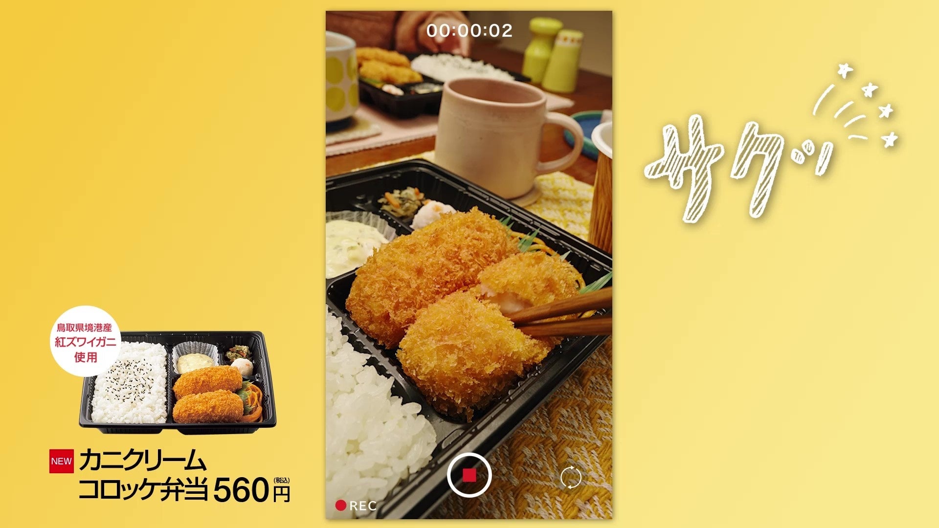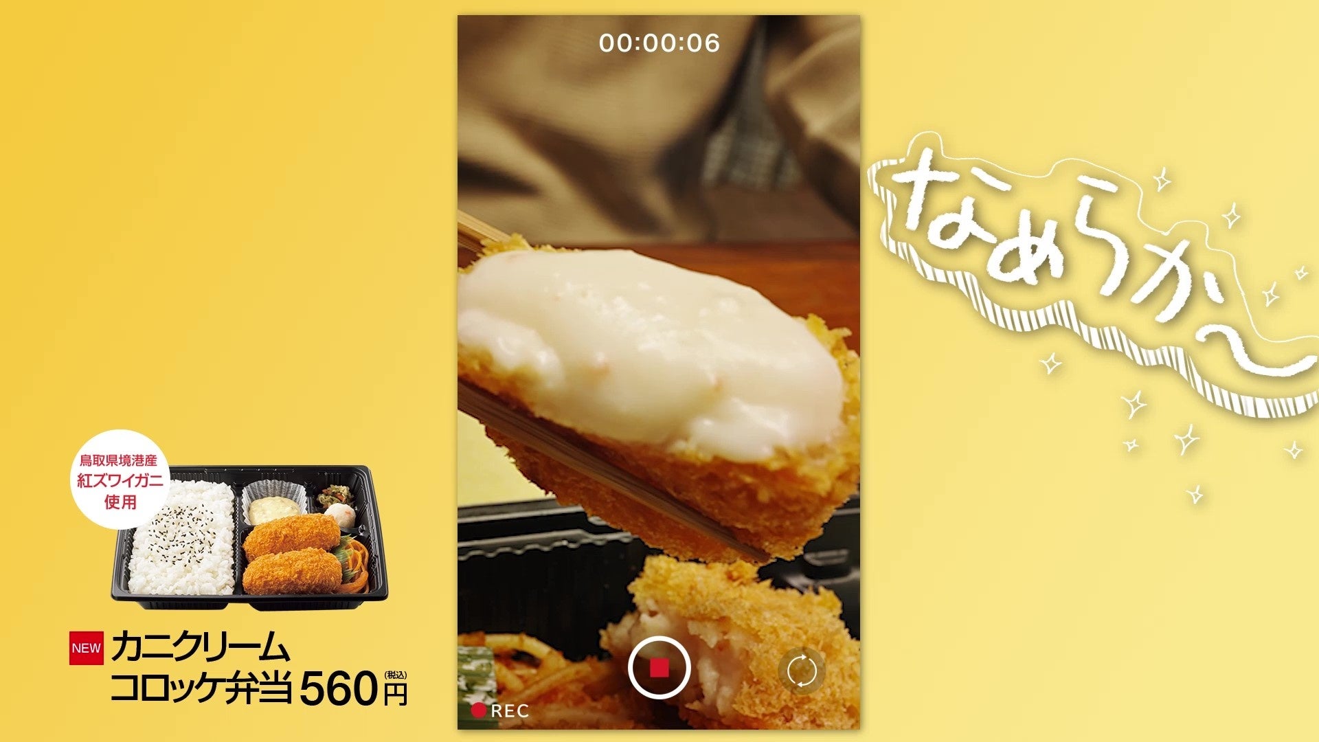 友人同士の賑やかな食事シーンの中で『カニクリームコロッケ弁当』の魅力を訴求しています。蓋を開けた瞬間、カニクリームコロッケ弁当に思わずテンションが上がってしまう場面から始まり、外はサクッと、中はとろーりなめらかな美味しさを賑やかな会話やテロップで紹介していきます。思わず箸が進んでしまう、新登場のカニクリームコロッケを「濃いするカニコロ」というフレーズで締めくくりました。