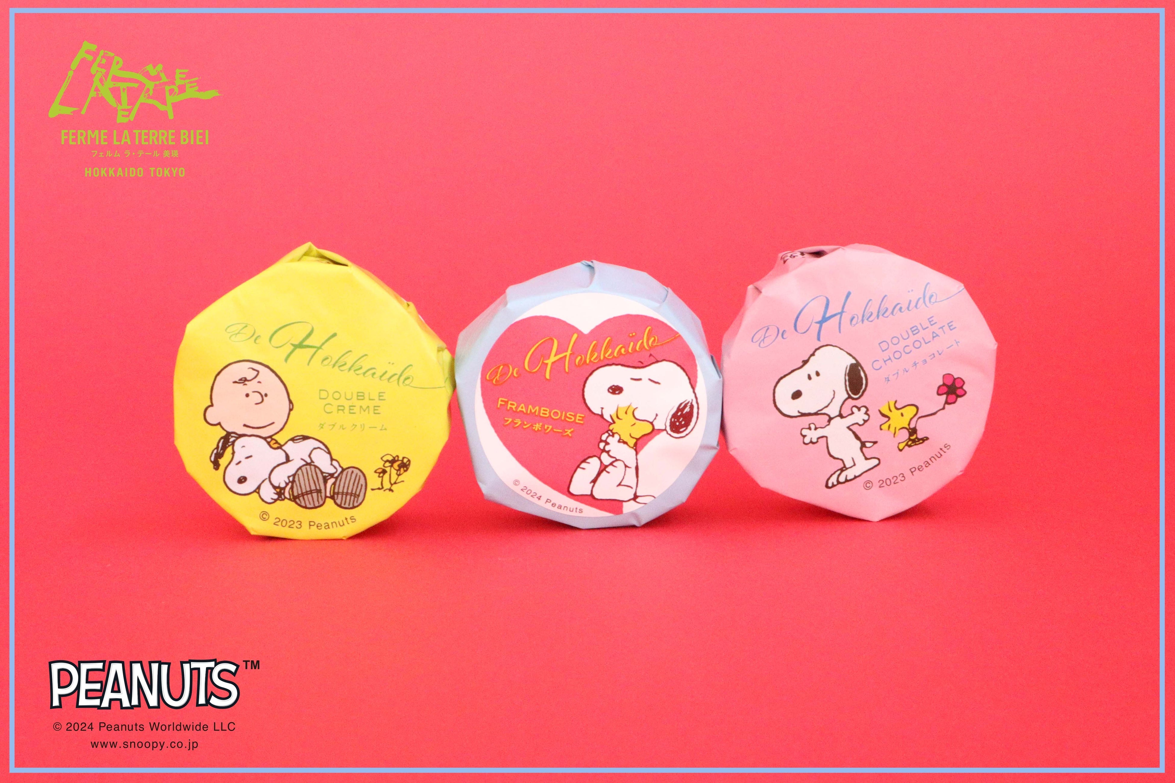チャーリー・ブラウンとスヌーピーが友チョコ?!お互いに贈りものをしあっているようにも見える、ギフトシーズンに最適な限定パッケージが新登場。ウッドストックも加わってハッピーなイメージになりました!ピンクとブルーで男女問わず選んでいただける色合いです。味揃えは定番一番人気のダブルクリーム、ダブルチョコレートに加えて、フランボワーズの季節限定ラベルが新たに仲間入り。ウッドストックをぎゅっと抱きしめるスヌーピーの後ろには大きなハートが描かれていて、バレンタインシーズンを盛り上げてくれること間違いなしです!