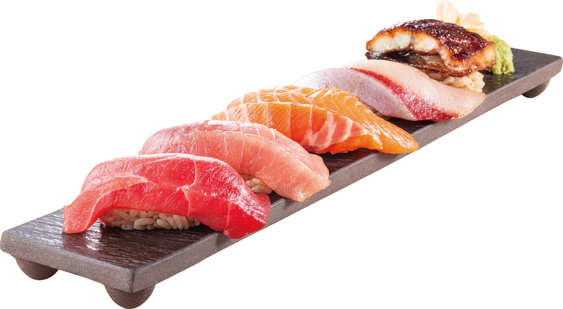 ※盛り合わせ内容:(左から)まぐろ、中とろ、生サーモン、ハマチ(ブリ)、うなぎ
