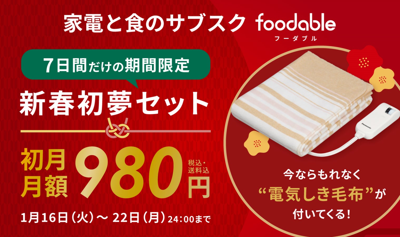 パナソニック株式会社(以下、パナソニック)は、家電と食のサブスクサービス「foodable(フーダブル)」にて、ポカポカ新春初夢セットを用意いたしました。調理家電、厳選食材に加え、電気しき毛布(シングルSサイズ DB-U12T)がついた特別セットは、初月月額980円(送料込み・税込み)で販売します。