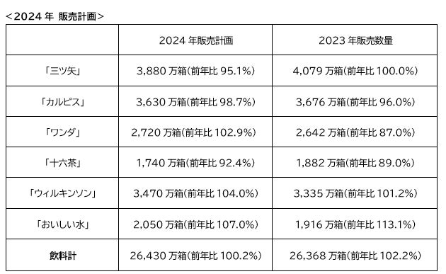2024年も市場や社会の変化に適応した新しい価値や多様化するお客さまのニーズをとらえ、140周年を迎える「三ツ矢」、120周年を迎える「ウィルキンソン」、「カルピス」の100年ブランドに注力すると共に、「無糖茶」「乳性/ヘルスケア」「炭酸」を軸に商品を通じてお客さまの驚きや喜びの創出を目指します。
