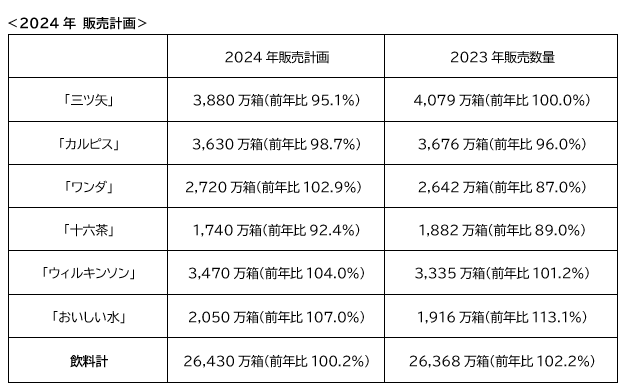 2024年も市場や社会の変化に適応した新しい価値や多様化するお客さまのニーズをとらえ、140周年を迎える「三ツ矢」、120周年を迎える「ウィルキンソン」、「カルピス」の100年ブランドに注力すると共に、「無糖茶」「乳性/ヘルスケア」「炭酸」を軸に商品を通じてお客さまの驚きや喜びの創出を目指します。
