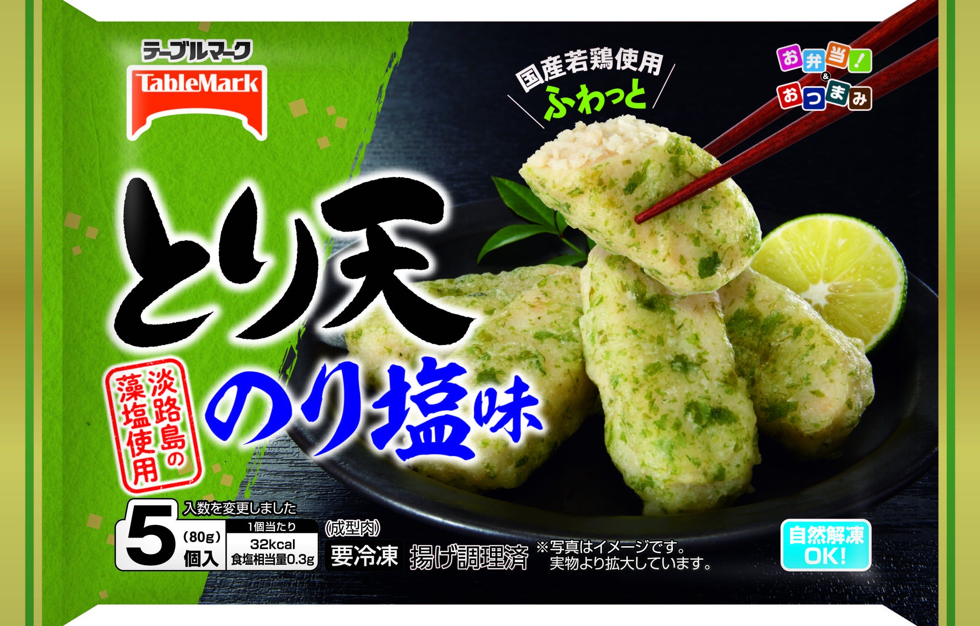 味付けは淡路島の藻塩を使ったのり塩味。シンプルな味わいの中にもあおさの風味感じるとり天です。便利な自然解凍です。