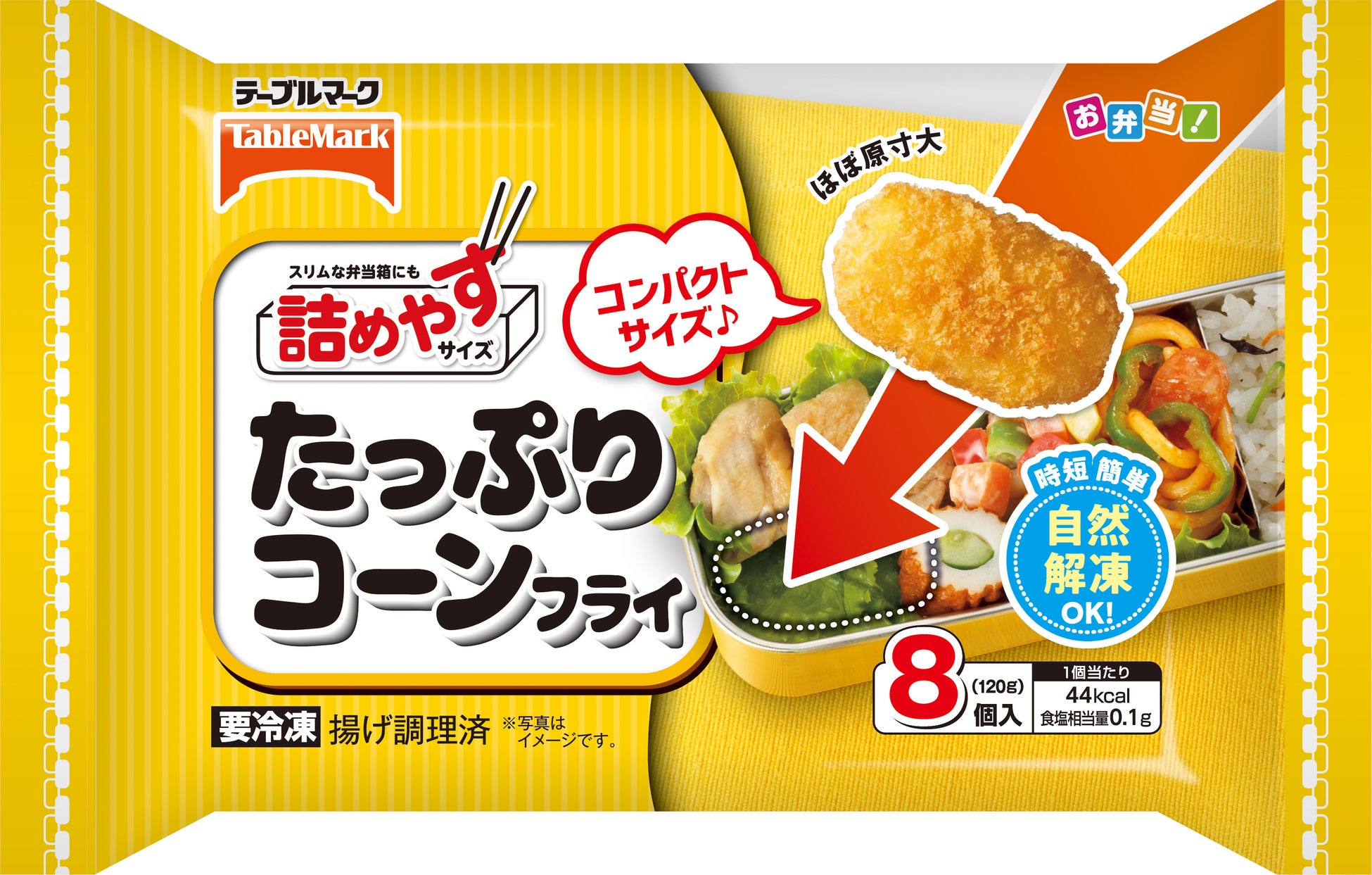 お弁当に詰めやすいコンパクトな「詰めやすサイズ」シリーズにコーンフライが新登場。小さいけれどつぶつぶコーンがしっかり入ったフライです。