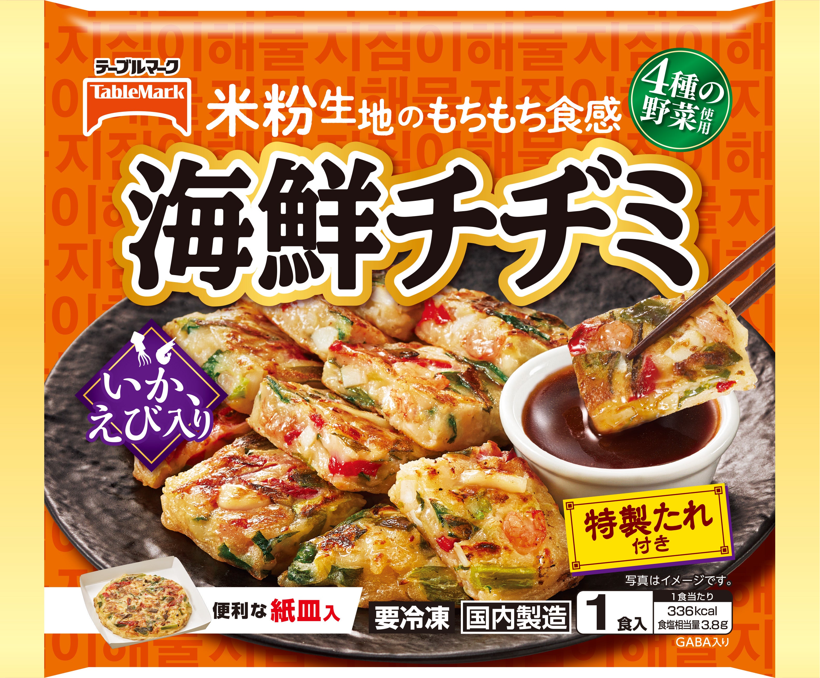 いかとえびをふんだんに使用し、海鮮の存在感抜群!6種具材で、具だくさんの海鮮チヂミに仕上げました。