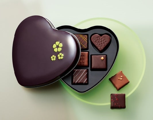 【横浜店のみ】素材の調和による香りと味わい。2024年の新作「マンダリン」をはじめ、ガナッシュやプラリネなど、〈パスカル・ル・ガック〉を代表するボンボンショコラを、ハート型の限定パッケージに詰め合わせた