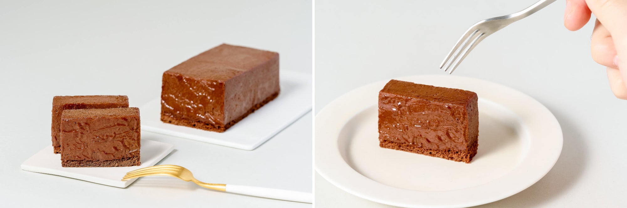 なめらかな口溶けで、チョコレートの濃厚な風味とカカオ由来のコクをお楽しみいただける生菓子です。王道で満足感たっぷりの甘い風味のチョコレートフレーバー「CLASSIC」をなめらかなテリーヌ生地に、ナッツのような風味とコクのあるチョコレートフレーバー「NUTTY」をスポンジ生地に使うことで、豊かな香りと満足感のある味わいを実現しました。